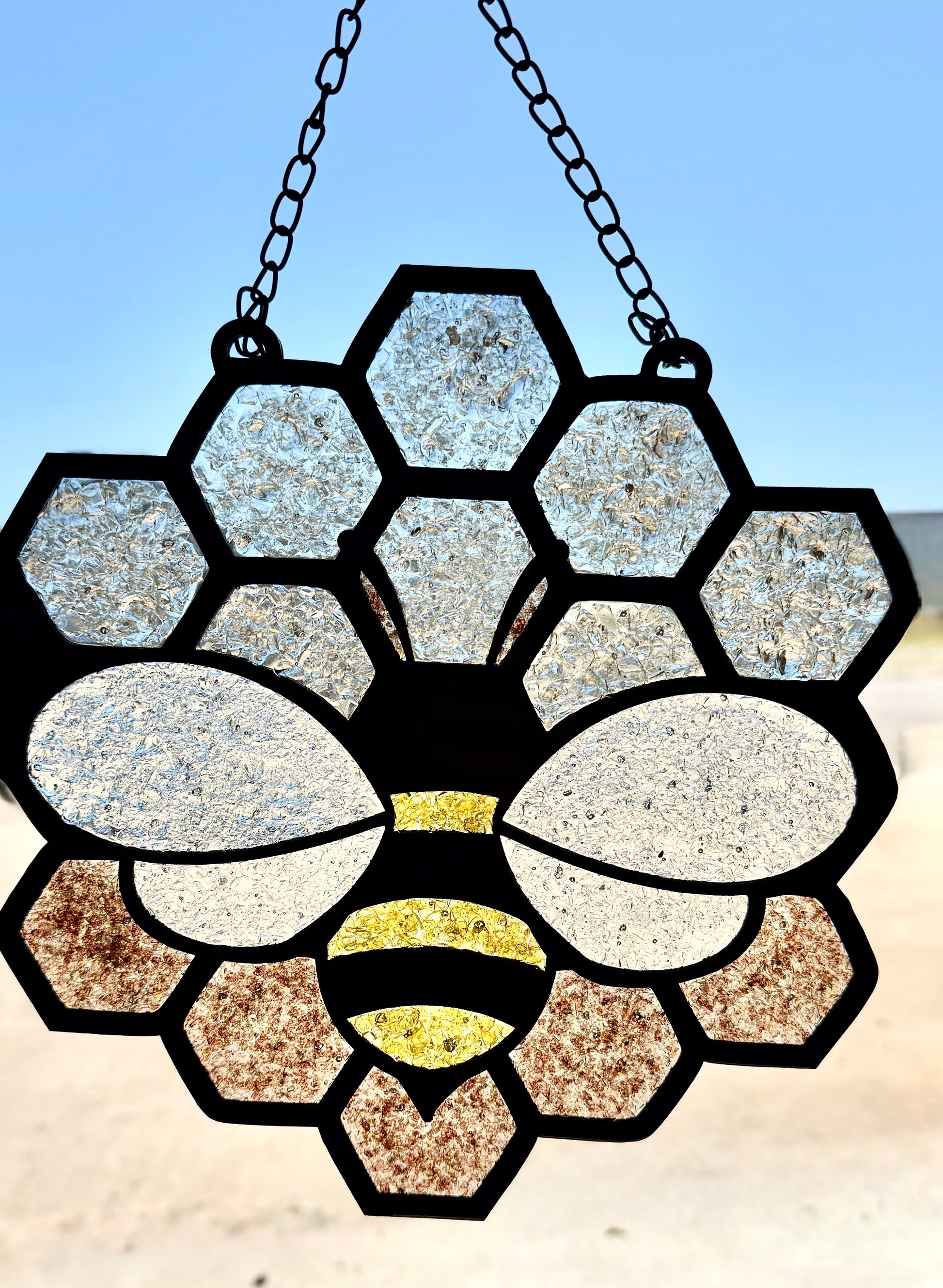 Unleash your creativity with our Bumble Bee and Honey Comb crushed glass mosaic. Crafted from birch wood and filled with colorful glass, rocks, and shells, this project lets you design your own faux stained glass masterpiece. Perfect for adding a unique, dimensional touch to your home décor or creating a charming sun catcher that brightens any room. This piece comes finished with a stylish chain hanger, available in gold, black, or silver. Embrace your artistic expression and elevate any space with this delightful DIY project.