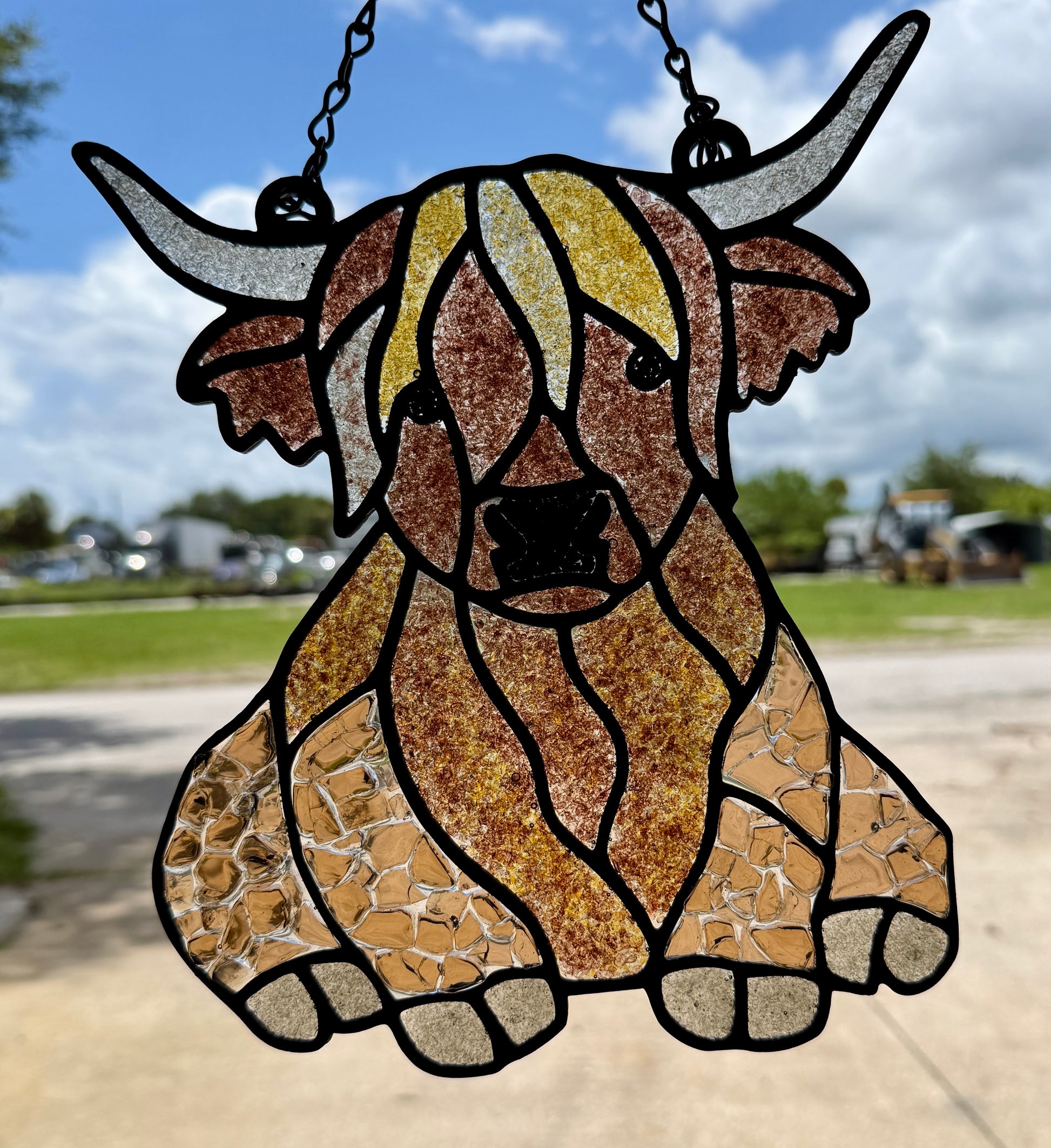 Unleash your creativity with our Highland Cow crushed glass mosaic. Crafted from birch wood and filled with colorful glass, rocks, and shells, this project lets you design your own faux stained glass masterpiece. Perfect for adding a unique, dimensional touch to your home décor or creating a charming sun catcher that brightens any room. This piece comes finished with a stylish chain hanger, available in gold, black, or silver. Embrace your artistic expression and elevate any space with this delightful DIY project.