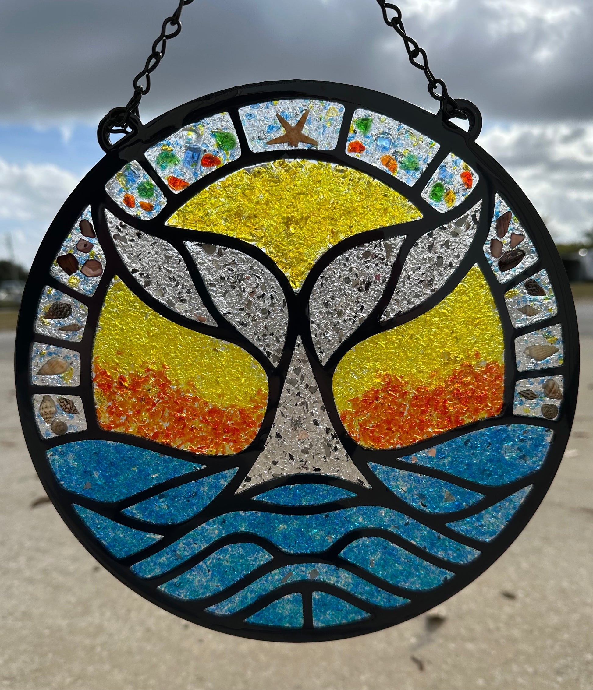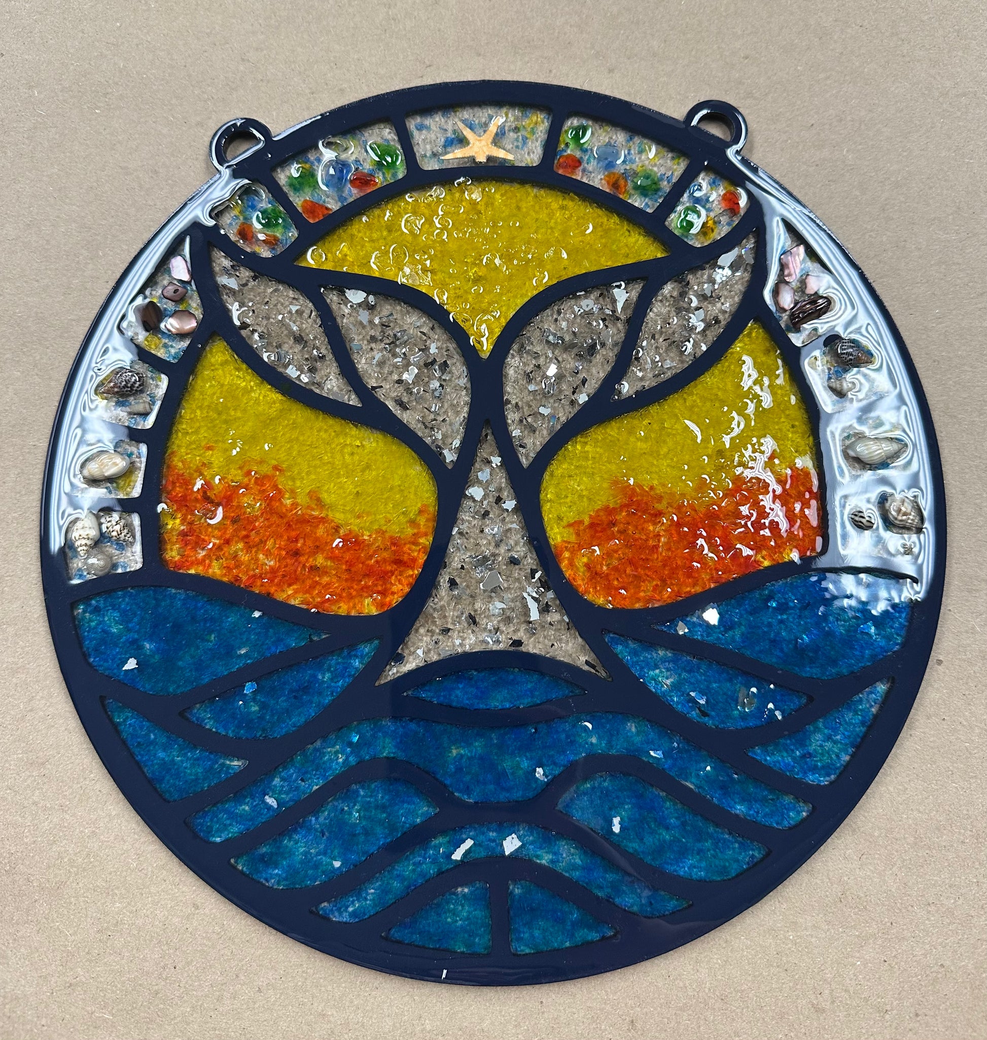Unleash your creativity with our Whale crushed glass mosaic. Crafted from birch wood and filled with colorful glass, rocks, and shells, this project lets you design your own faux stained glass masterpiece. Perfect for adding a unique, dimensional touch to your home décor or creating a charming sun catcher that brightens any room. This piece comes finished with a stylish chain hanger, available in gold, black, or silver. Embrace your artistic expression and elevate any space with this delightful DIY project.