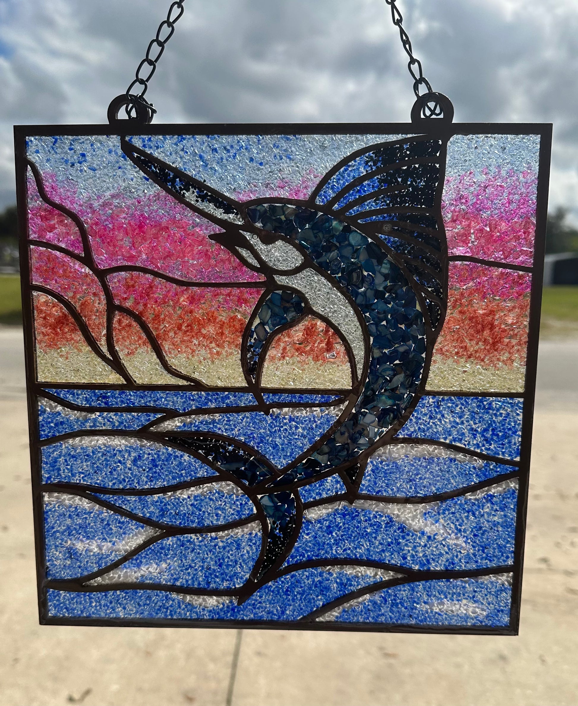Unleash your creativity with our Marlin crushed glass mosaic. Crafted from birch wood and filled with colorful glass, rocks, and shells, this project lets you design your own faux stained glass masterpiece. Perfect for adding a unique, dimensional touch to your home décor or creating a charming sun catcher that brightens any room. This piece comes finished with a stylish chain hanger, available in gold, black, or silver. Embrace your artistic expression and elevate any space with this delightful DIY project.