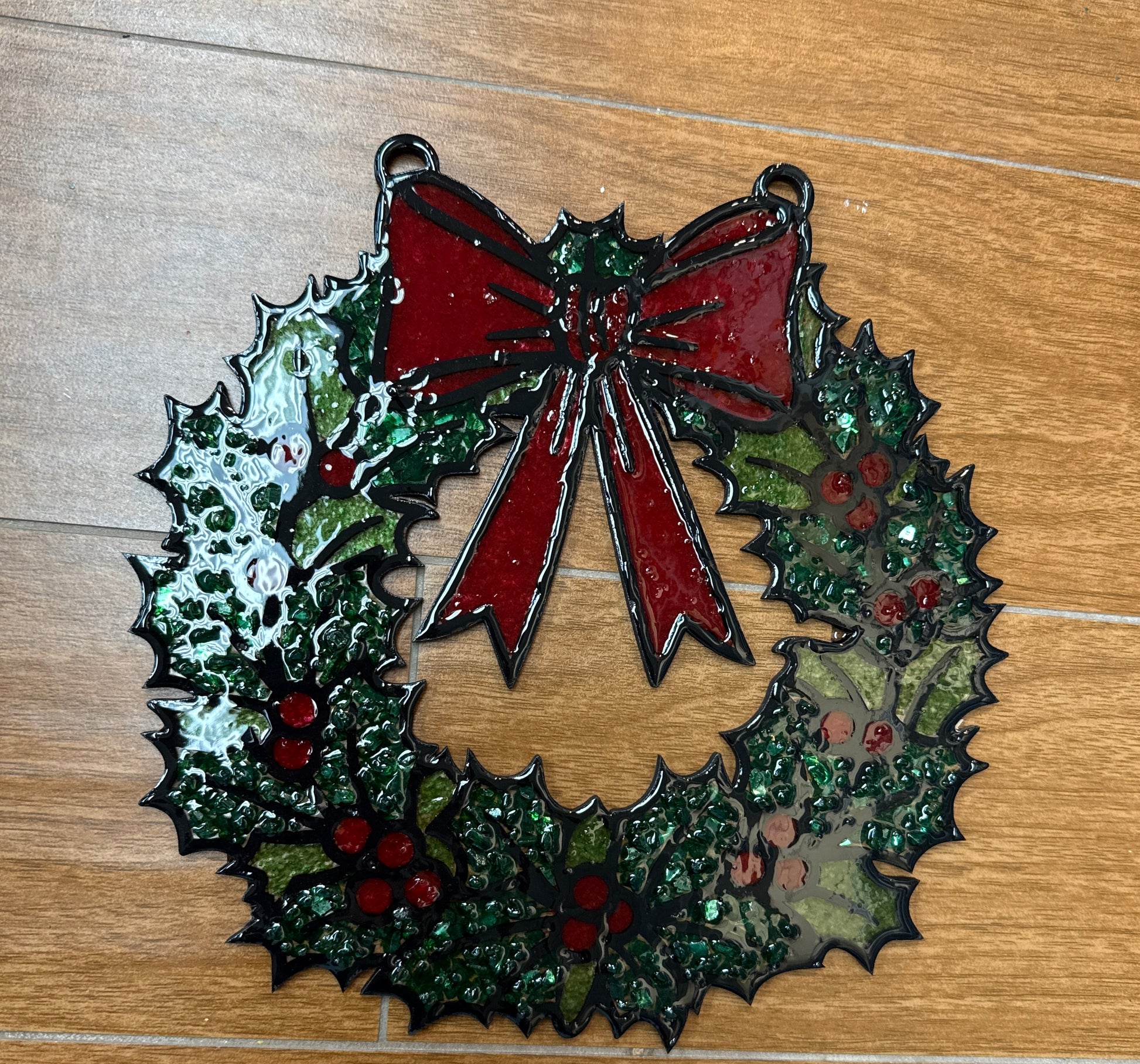 Unleash your creativity with our Christmas Wreath crushed glass mosaic. Crafted from birch wood and filled with colorful glass, rocks, and shells, this project lets you design your own faux stained glass masterpiece. Perfect for adding a unique, dimensional touch to your home décor or creating a charming sun catcher that brightens any room. This piece comes finished with a stylish chain hanger, available in gold, black, or silver. Embrace your artistic expression and elevate any space with this delightful DIY project.